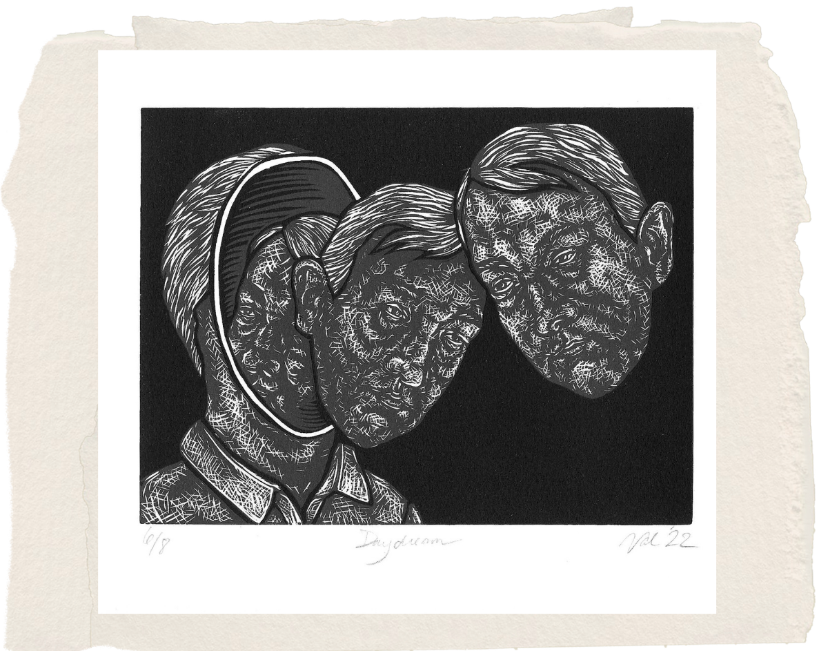 I am a Canadian printmaker specializing in relief print and lithography, with a strong focus on hand-printed techniques. My process begins with figurative drawings that evolve through sketches and further transformation during platemaking and printing. This journey allows me to explore the inner world of my subjects, resulting in a series of unconventional portraits that reflect on existence and perceptions of self.